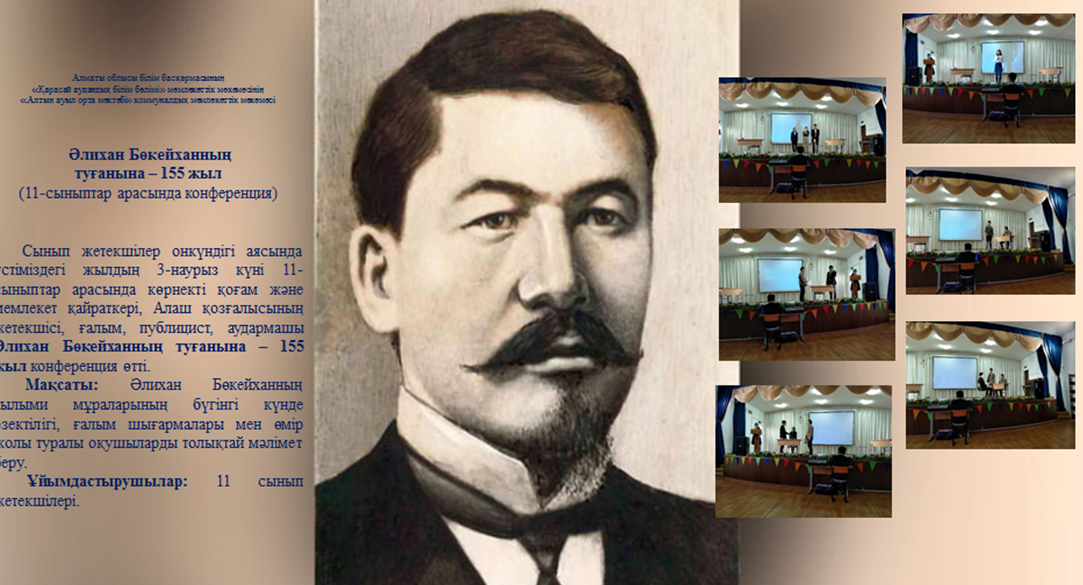 Әлихан Бөкейханның туғанына – 155 жыл (11-сыныптар арасында конференция) » Қарасай ауданы «Алтын ауыл орта мектеп мектепке дейінгі шағын орталықпен» Education Department of Kerbulak district