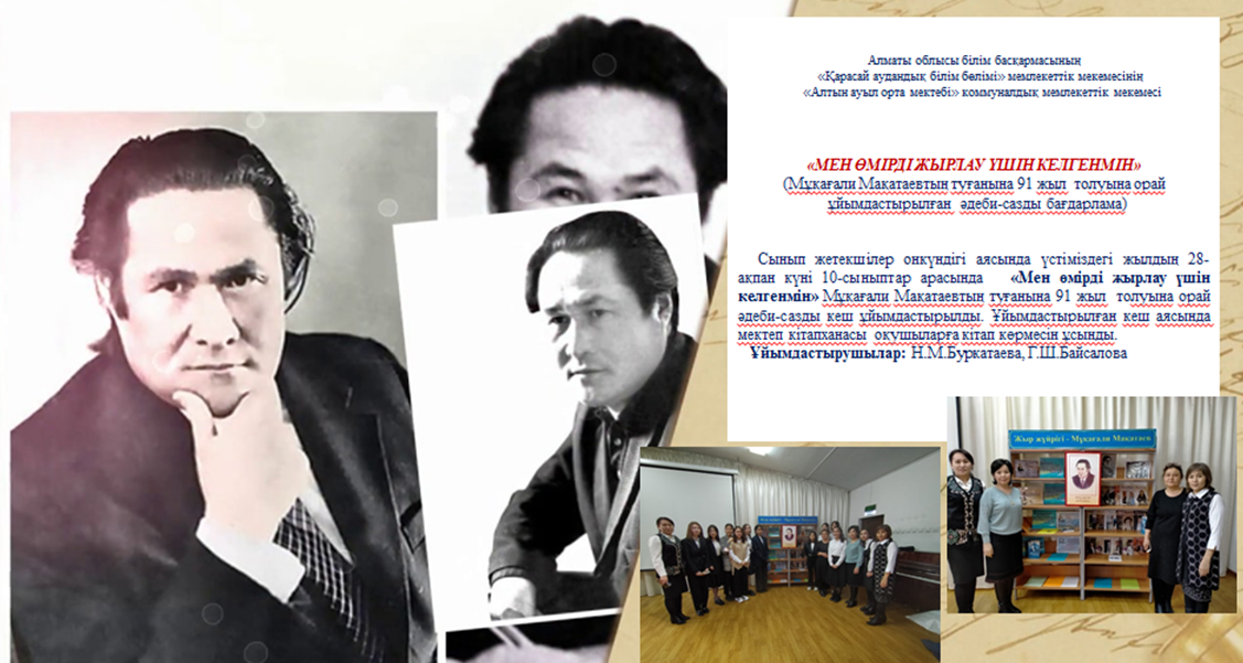 28 февраль 2022 0 1 2 3 4 5 «МЕН ӨМІРДІ ЖЫРЛАУ ҮШІН КЕЛГЕНМІН» (Мұқағали Мақатаевтың туғанына 91 жыл толуына орай ұйымдастырылған әдеби-сазды бағдарлама)
