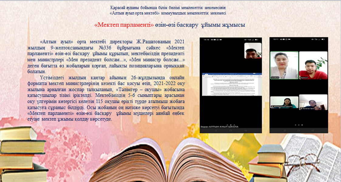 «Мектеп парламенті» өзін-өзі басқару ұйымы жұмысы » Қарасай ауданы «Алтын ауыл орта мектеп мектепке дейінгі шағын орталықпен» коммуналдық мемлекеттік мекемесі