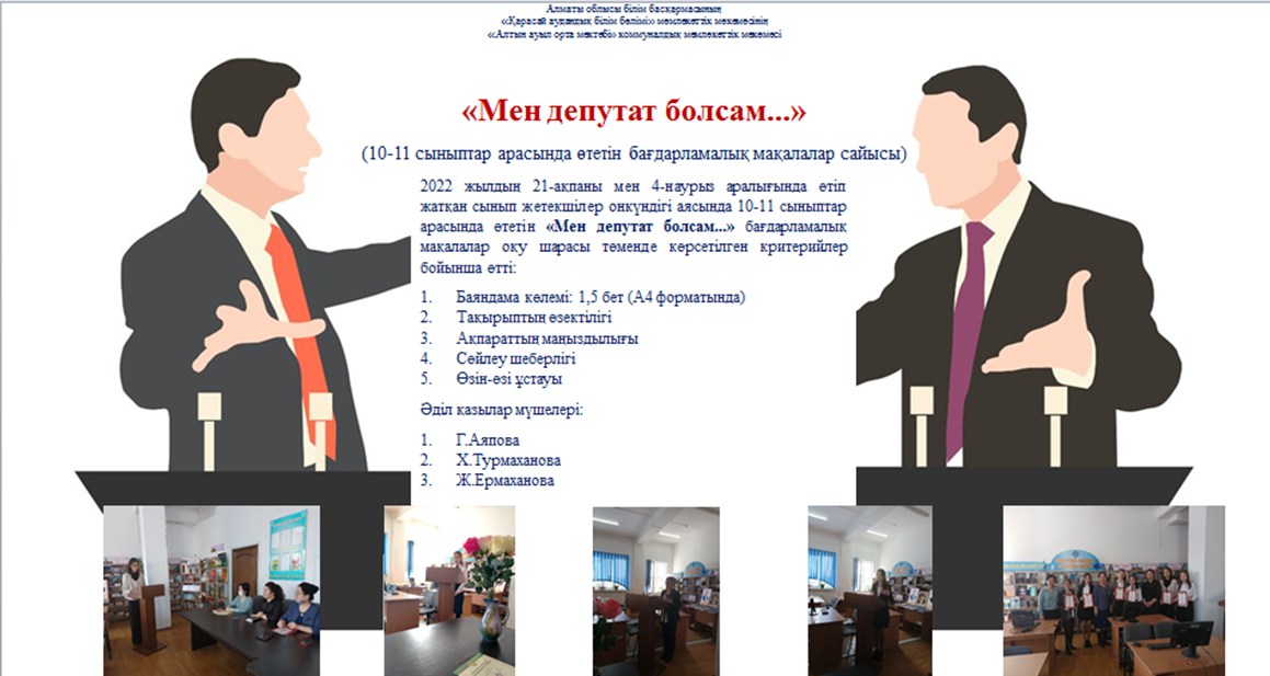 04 март 2022 0 1 2 3 4 5 «Мен депутат болсам...» (10-11 сыныптар арасында өтетін бағдарламалық мақалалар сайысы)