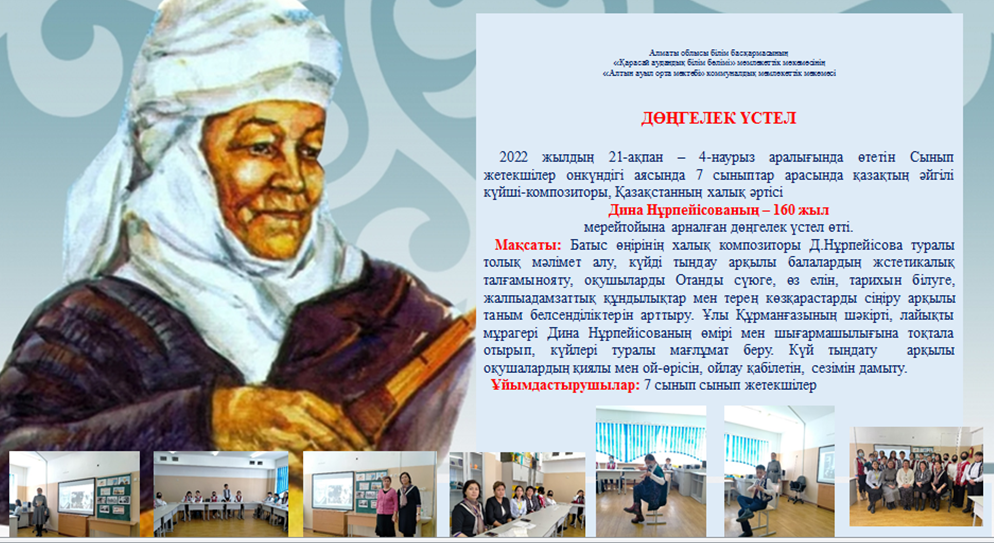 Дина Нұрпейісованың – 160 жыл мерейтойына арналған дөңгелек үстел өтті. » Қарасай ауданы «Алтын ауыл орта мектеп мектепке дейінгі шағын орталықпен» коммуналдық мемлекеттік мекемесі