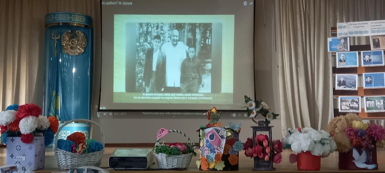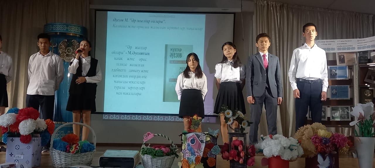 Қыркүйек айының 28_ші жұлдызында мектебімізде Мұхтар Әуезовтің 125 жылдығына арналған: "Асқар тау алыстаған сайын айқын көріне түседі..." атты әдеби танымдық кеш өтті. Кеш барысындағы Мұхтар Әуезовтің жанды дауысындағы бейне жазбасы ерекше әсерге бөледі. Аталған кештің ұйымдастырылуына мұрындық болған 10-сынып жетекшілеріне және жауапкершілікпен өткізген Кутжанова Динар Саттеровнаға әкімшіліктің атынан шығармашылық табыс тілейміз.