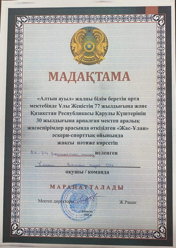 12 май 2022 0 1 2 3 4 5 Ұлы Жеңістің 77 жылдығына арналған мектеп аралық жасөспірімдер арасында өткізілген
