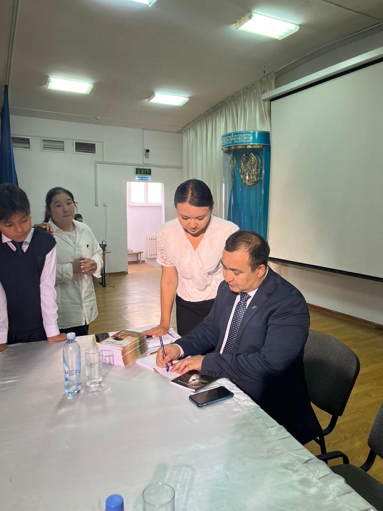 Мектебімізде “Мемлекеттік тіл - менің тілім” онкүндігінің кезекті іс-шарасы өтілді. Ақын, аудармашы, “Серпер” сыйлығының лауреаты, Қазақстан Жазушылар одағының мүшесі, ҚР Информация саласының үздігі, ҚР Мәдениет саласының үздігі Саят Қамшыгермен кездесу өтті. Оқушыларды ақынның шығармашылығымен таныстырып, патриоттық рух беріп, адамгершілік қасиеттерге баулу, ақын өлеңдері арқылы халқына, тілге, Отанға деген сүйіспеншілік сезімдерін оятуды мақсат еткен кездесуде қызықты әңгімелер өрбіді. Жылы жүзді, дархан жүректі ақынның ғибратты әңгімесінен қатысушылар ерекше әсер алды. Қонағымызға шығармашылығы, өмірлік ұстанымдары туралы сұрақтар қойылып, 7 “А” сынып оқушысы Коел Ақерке “Сағыныш” мен 7 “А” сынып оқушысы Каирбаева Жанерке “Туған елім”өлеңдерін оқыды. Кездесуді ұйымдастырған: “Жас қаламгер” ұйымының жетекшісі, қазақ тілі мен әдебиеті пәнінің мұғалімі Сатыбалды Майра Нұрланқызы.